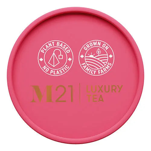 Packaged in a paper-based canister with 12 plant-based pyramid tea bags.