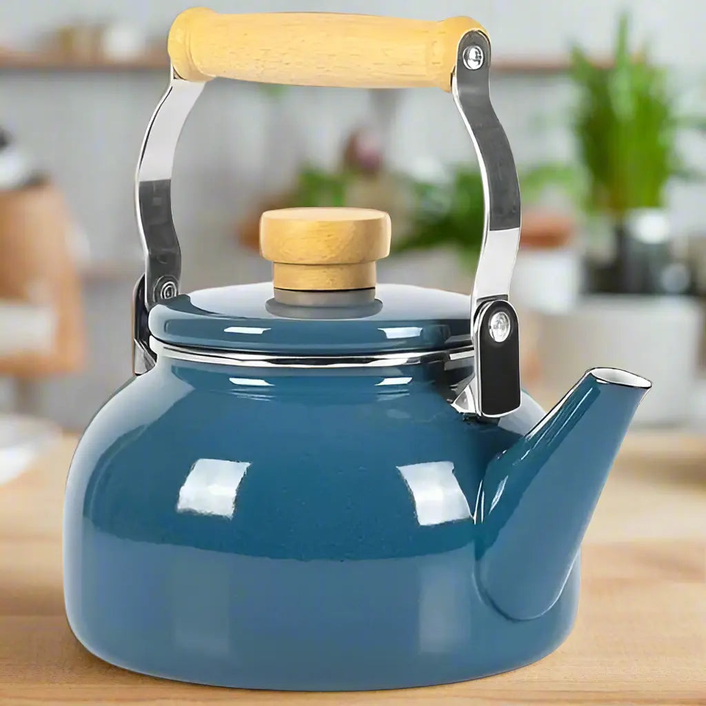 • 1.5 Qt. Steel Teapot Kettle w/ Blue White Glossy Enamel Coating and Wood Handle