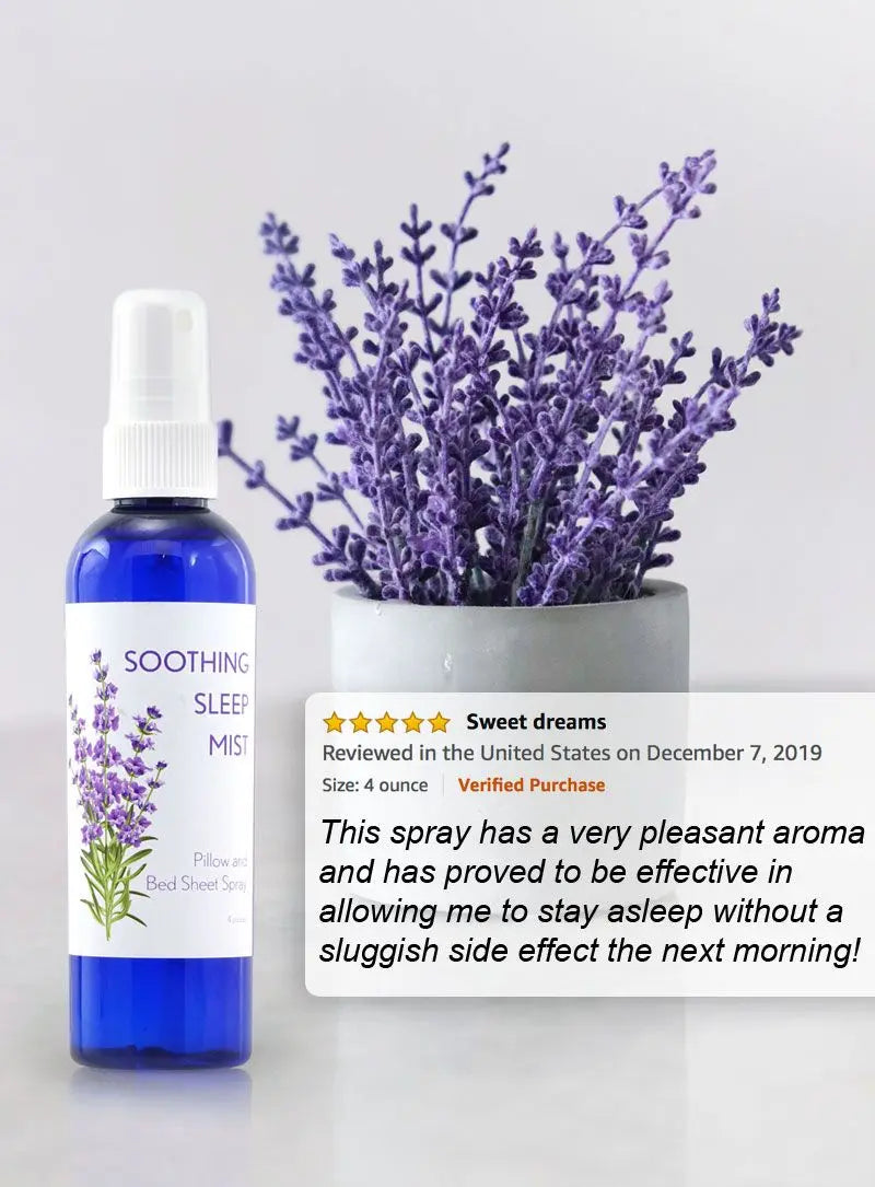 8 ounce spray mister. Designed for better sleep; our Soothing Sleep Mist is hand-crafted in the United States with 100% pure ORGANIC essential oils of Lavender and COMPLIMENTING ESSENTIAL OILS; Amethyst Crystals and Reiki charged. Carefully formulated to ensure you get the best sleep possible. These oils and Amethyst crystals are well known for their calming effect; ability to promote restful sleep and alleviating anxiety and stress. See how sleep can be effortless and easy once again with our Soothing Sleep Mist! PLEASE NOTE WE ONLY USE ORGANIC ESSENTIAL OILS. WE ONLY USE PURE UNTREATED NATURAL SPRING WATER; NOT CITY CHLORINATED TAP WATER AS DO MOST OTHER COMPETITORS. (cap color may vary)